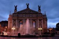 L'viv Ukraine Fountain in front of the Opera Theatre on Svobody Prospekt.