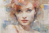 Lynn Portret - abstract schilderij / mixed media kunst geschilderd. Mooi contrast tussen het verfijnde portret en rauwe collage/schildertechniek.