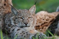 Lynx (Lynx lynx) die zich uitrekt en strekt, mooie blik in zijn heldere ogen, grappige dierenfoto, Europa.