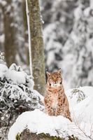 Een lynx zit op een rots in het besneeuwde bos en kijkt recht in de camera.