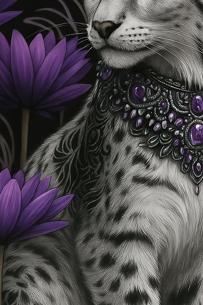 Ze is een trots dier, een prachtige Lynx, ze bekijkt als een Griekse godin haar omgeving. Prachtig zit ze tussen paarse bloemen en is zeer content met de wereld.