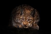 Lynx kijkt nieuwsgierig uit de duisternis (hinderlaag) zwarte nachtelijke achtergrond. een mooie kattenlynx zit op een steen