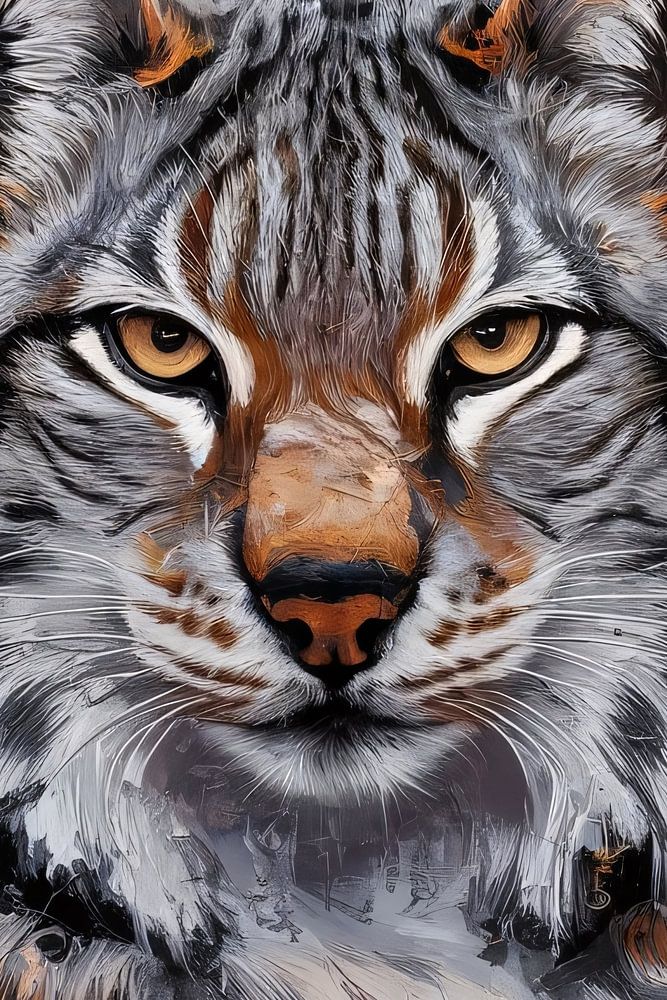 Dit unieke kunstwerk toont de imposante kop van een lynx, omringd door een abstracte, dynamische achtergrond die de kracht en elegantie van het dier benadrukt. De kleuren, variërend van zachte grijstinten tot krachtige oranje accenten, creëren een boeiend contrast dat de aandacht trekt. De precieze details van de lynx, zoals de scherpe ogen en het sierlijke vachtpatroon, maken dit stuk bijzonder intrigerend. Dit ontwerp zou perfect passen in een moderne woonkamer of een kantooromgeving, waar het een vleugje natuur en wilde schoonheid toevoegt aan de ruimte. Het is een krachtige combinatie van digitale kunst en realisme, met een vleugje abstractie dat het geheel dynamisch en expressief maakt.