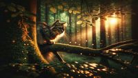 Een prachtige lynx zit op een met mos bedekte tak in een lichtdoorstroomd bos. Zijn ogen zijn alert en hij lijkt aandachtig te luisteren naar de geluiden en bewegingen om hem heen. De laagstaande zon achter de bomen baadt het bos in een zacht licht dat de bladeren en het mos laat gloeien. Kleine lichtdeeltjes zweven door de lucht,…