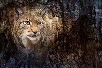 Portret van een lynx in het bos, met natuurlijke structuren van bos, bomen en spinnenwebben gemaakt tot geheel.