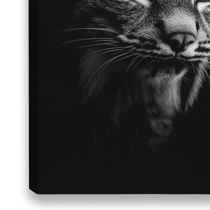 Een indrukwekkend portret van een wilde kat die fascineert met zijn fascinerende details en intense ogen. De dramatische zwart-wit esthetiek geeft de foto een mysterieus aura dat perfect is voor een moderne woonkamer of een creatief kantoor. Hier nodigt de blik van het dier je uit om te dromen en na te denken.