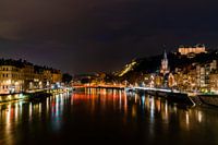 zicht over de Saone in Lyon, Frankrijk met zicht op de beide oevers van de stad bij nacht