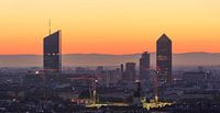 De torens van Part-Dieu, in het zakencentrum van Lyon, en drie kranen in het oude centrum vlak voor een kleurrijke zonsopkomst in de nazomer.