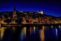 De foto toont een nachtelijk stadsgezicht aan de oevers van de Saône. Op de voorgrond is kalm, donkerblauw water met zachte weerspiegelingen van de stadslichten. Daarachter staat een rij kleurrijk verlichte oude stadsgebouwen aan de Quai Fulchiron. Links staat de Église Saint-Georges met zijn hoge, spitse toren. Op de heuvel op de…