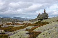 Een bijzonder hoogvlakte in Lysebotn, Noorwegen. Massa's ronde rotsblokken liggen verspreid over stompe rotsen, bekleed met mooi gekleurde mossen en grassen. Daartussen plassen water.