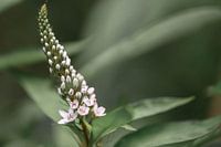 close up van de Lysimachia, ofwel wederik, een witte zomerbloeiende plant, met een zachte groene achtergrond