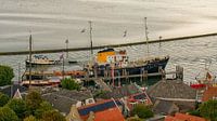 Haven en stukje dorp West van het waddeneiland Terschelling, vanaf de vuurtoren Brandaris. De historische Zeesleepboot m.s. Holland ligt op haar vertrouwde, vroegere plek aan de steiger.