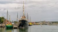 Haven en dorp West van Waddeneiland Terschelling. De historische Zeesleepboot m.s. Holland ligt op haar vertrouwde, vroegere plek aan de steiger.