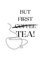 Een elegante fine art print met een theekopje in een minimalistische lijntekeningstijl. De tekst "BUT FIRST coffee" is op humoristische wijze doorgestreept en vervangen door "TEA". Perfect voor theeliefhebbers die houden van stijl en humor in hun keuken, kantoor of woonkamer.