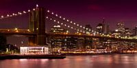 Nachtelijke skyline van het zuidelijke deel van New York City met de Brooklyn Bridge op de voorgrond. De lichten van de metropool worden weerspiegeld in de East River.