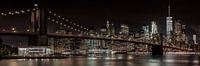 Charmante nachtelijke skyline van het zuidelijke deel van Manhattan met op de voorgrond de Brooklyn Bridge. De lichten van de metropool worden weerspiegeld in de East River. Een klassiek stadsgezicht vanuit New York City.