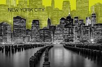 Een kleurrijke silhouet van New York City. De sfeer weerspiegelt een stedelijke dynamiek. Een decoratief kunstwerk van grafische vormgeving en moderne constructies. Unieke mix van pop art en poster stijl. Betoverende nacht skyline van het zuidelijke deel van Manhattan. De lichten van de stad weerspiegeld in de East River.