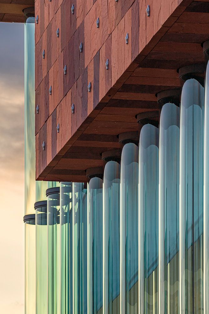 Als de zon ondergaat krijg je een prachtig lichtspel te zien zoals hier bij het museum MAS in Antwerpen.