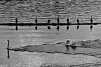 Zwanen en aalscholvers aan de Moldau
