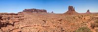 Monument Valley is een vlakte op het Colorado Plateau aan de zuidgrens van de Amerikaanse staat Utah met Arizona. Het ligt in het Navajo Nation Reservaat. Het landschap heeft gediend als decor voor vele films. Hier is een mooi uitzicht op de bekendste hoogten (Sentinel Mesa, West Mitten Butte en East Mitten). Prachtig landschap om van te genieten!