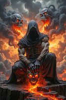 Uit de vurige wolken van verdoemenis rijst een fantoom op, wiens gezicht voor altijd in duisternis verborgen blijft. In zijn handen houdt hij een hels masker, waarvan de ogen gloeien als brandende kolen die in de zielen van de verdoemden staren, terwijl boven hem spookachtige schedels rondcirkelen in de rook van de apocalyps. Onder zijn voeten scheurt de aarde open, en lavastromen vloeien als het bloed van de hel door het gebroken gesteente.