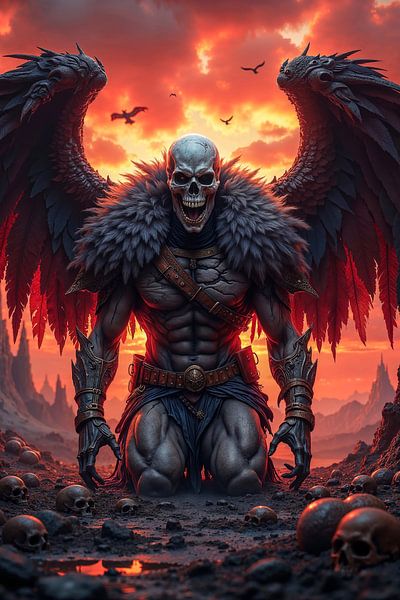 Een massieve demon knielt op een verwoest slagveld, omringd door verspreide schedels en gebarsten aarde. Zijn lichaam is gespierd en gespannen, het gezicht bestaat uit blootliggende botten met een lege blik. Grote donkere vleugels rijzen achter hem op terwijl de hemel rood gloeit van rook en vuur.