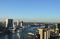 MS Rotterdam en Norwegian Star in de vroege ochtend in Rotterdam 26 September 2015. Met in de voorgrond de Maas en Erasmusbrug en op de achtergrond de Rotterdam, Montevideo, het World Port Center, een mooi blauwe hemel en een prachtig helder groene landschap onder een deken van mist.