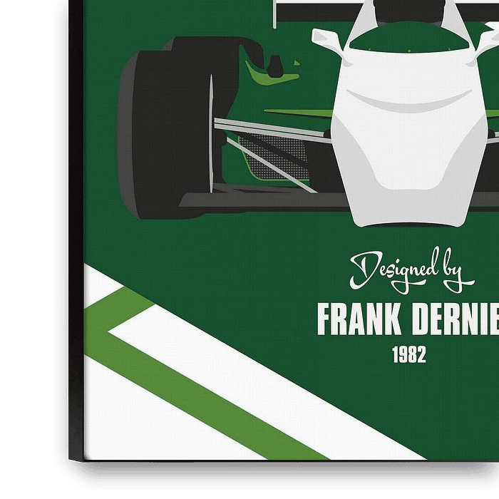 A stylized graphic of Keke Rosberg's Williams Racing FW08 Formula 1 car dominates the foreground against a against a striking blue and green background. The F1 car design is attributed to Frank Dernie, 1982,…