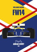 A stylized graphic of Nigel Mansell's Williams Racing FW14 Formula 1 car dominates the foreground against a against a striking yellow and blue background. The F1 car design is attributed to Adrian Newey, 1992, and is presented in a minimalistic style with bold colors and clean lines.