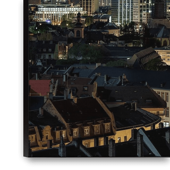 Dompel jezelf onder in de fascinerende wereld van de skyline van Frankfurt bij nacht! Deze exclusieve muurschildering vangt de indrukwekkende sfeer van het bankdistrict wanneer de stad in absolute duisternis is gehuld en de lichten van de wolkenkrabbers een adembenemende achtergrond vormen.