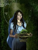 Dierenriemteken Maagd uit mijn Fantasy Dierenriem serie. Haar element is aarde, gesymboliseerd door de boom in de schaal en de bosrijke omgeving. Haar planeet is Mercurius in de linkerbovenhoek.