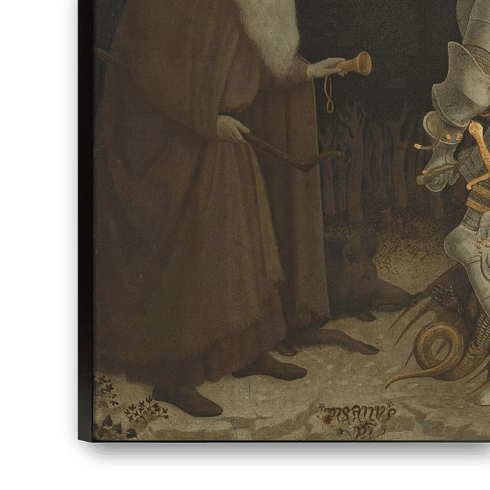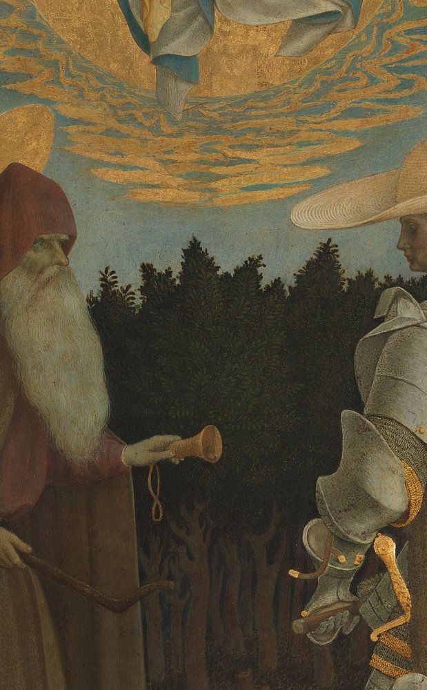 Maagd en kind met heiligen, Pisanello (1435) Dit raadselachtige schilderij lijkt een afbeelding in twee helften. Bovenaan omhelzen de Maagd en het Kind elkaar in een vergulde zonnestraal. Onderaan luidt de heilige Antonius Abt zijn bel en glundert hij naar een elegante ridder. Dit is Sint Joris, gekleed in een vijftiende-eeuws harnas en een stijlvolle strooien hoed - een eigentijdse Franse mode. Zijn embleem van de draak krult om zijn benen, snauwend naar Anthony's zwijn.