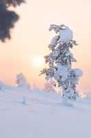 Een mistige ochtend bovenop de skiheuvel van Saariselkä in Lapland. Toen de zon uiteindelijk opkwam, zorgde dit echter voor prachtige kleuren in de lucht met als contract de witte, besneeuwde bomen.