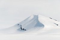 Een maagdelijk witte berg op Spitsbergen. Enkele gitzwarte stenen priemen door de sneeuwlaag en absorberen de warmte van de zon. Een witte lucht, de witte sneeuw een onvergetelijke aanblik.
