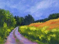Een landweggetje slingert door een weelderig landschap met groene bomen aan de linkerkant en een veld met gele bloemen aan de rechterkant. Het pad leidt naar een bos op de achtergrond. De lucht erboven is levendig…