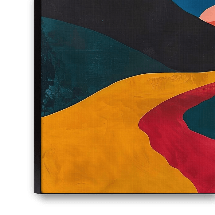 Een minimalistisch kunstwerk bevat een landschap met opvallende bergformaties, gerealiseerd in de stijl van het expressionisme, met de maan aan de horizon.