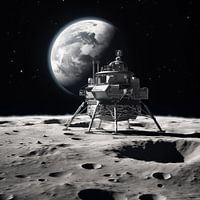 Unieke Maan Lunar lander met uitzicht op de aarde zwart-wit schilderij met een originele stijl. Met prachtige kleurtinten en een uniek ontwerp maakt dit tot een stijlvolle fotoprint die prachtig staat in elke ruimte.