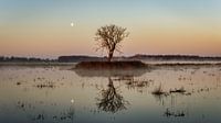 Afnemende maan boven een solitaire boom in het Kloosterveld. Het Kloosterveld is een deel van het Nationaal Park Dwingelderveld in Drenthe in Nederland.