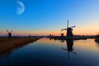 De maan is zichtbaar boven de kinderdijk en de mooie windmolens in het avondlicht.