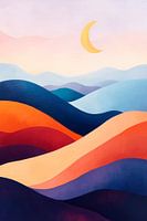 Zachte golven in harmonieuze kleuren dansen onder een zachte maan. De warme tinten oranje en diepblauw geven dit kunstwerk een rustgevende sfeer die uitnodigt om te dromen. Het is perfect voor een slaapkamer en creëert een vredige omgeving waar ontspanning en fantasie samensmelten.
