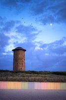 De maan staat boven de watertoren van Domburg, die samen met de strandhuisjes en duinen nog wordt verlicht door de gloed van de zonsondergang.