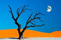 Een verweesde boom met knoestige takken steekt majestueus af tegen de heldere, eindeloze lucht. De stralende schijf van de maan fonkelt boven de fel oranje duinen, terwijl het contrast tussen de levenloosheid van de boom en het levendige landschap een surrealistische sfeer creëert. Hier ontmoet eenzaamheid het mysterie van maanlicht.