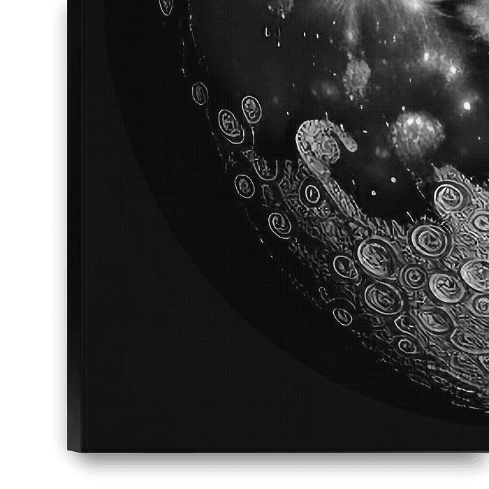 "Mondechos" is een indrukwekkende zwart-witafbeelding van de maan, waarop het grillige oppervlak opmerkelijk gedetailleerd te zien is. Ingewikkelde kraterformaties en gloeiende radiale lijnen suggereren de nasleep van een meteorietinslag en leggen de rauwe schoonheid van dit hemellichaam vast. Het onderste gedeelte toont abstracte…