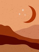 Dit kunstwerk toont een rustgevend retro-landschap met een opkomende volle maan boven zachte, glooiende heuvels. De minimalistische vectorstijl, versterkt met subtiele textuur, maakt gebruik van warme terracotta- en sepiatinten om een serene sfeer te creëren. Dit ontwerp is geïnspireerd op boho-interieurs en vintage poster-esthetiek en werkt prachtig in Scandinavische, Japanse of moderne rustieke ruimtes. De eenvoud en symmetrie bieden een gevoel van rust, waardoor het ideaal is voor slaapkamers, meditatiehoeken of gezellige woonkamers. Als onderdeel van een samenhangende serie met vergelijkbare thema's en paletten, geeft dit stuk een harmonieuze touch aan galerie muren of op zichzelf staande displays. De natuurlijke vormen en warme kleuren passen perfect in een seizoensstijl en roepen rustige herfstavonden en stille woestijnlandschappen op. Een must-have voor liefhebbers van retro design, warme kleuren en moderne bohemien interieurs.