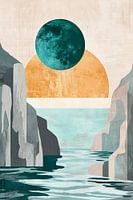 Een harmonieus samenspel van zachte kleuren en geometrische vormen ontvouwt de magie van een rustig kustlandschap. Het grootste deel van de afbeelding wordt gedomineerd door een indrukwekkende maan en een gouden zon die over ruige rotsen schijnt. Dit kunstwerk is ideaal voor de woonkamer en creëert een uitnodigende, ontspannen sfeer.