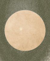 Een minimalistische abstracte voorstelling van de volle maan in zacht licht in neutrale beige kleuren op een groene achtergrond.