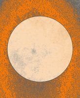 Een minimalistische abstracte voorstelling van de volle maan in zacht licht in neutrale beige kleuren op een oranje achtergrond.