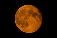 Maan met een duidelijk zichtbaar maanoppervlak aan de donkere nachthemel. De maan is oranje door vocht in de lucht net na zonsondergang.