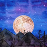 Berglandschap in waterverf met digitaal ingemonteerde maan achter de bergen. De hemel is bezaaid met sterren. Op de voorgrond staan wat dennenboompjes.
