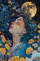 Verlies jezelf in de dromerige wereld van dit digitale schilderij. De serene uitdrukking van de vrouw en de levendige kleuren creëren een gevoel van rust en verwondering.